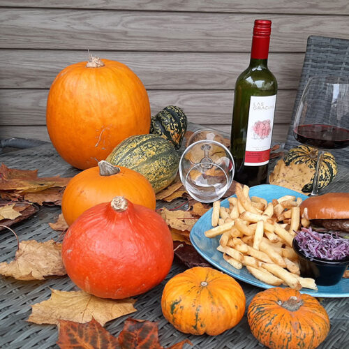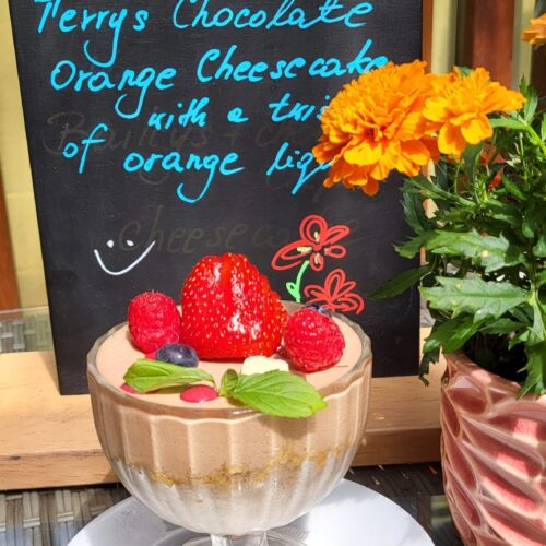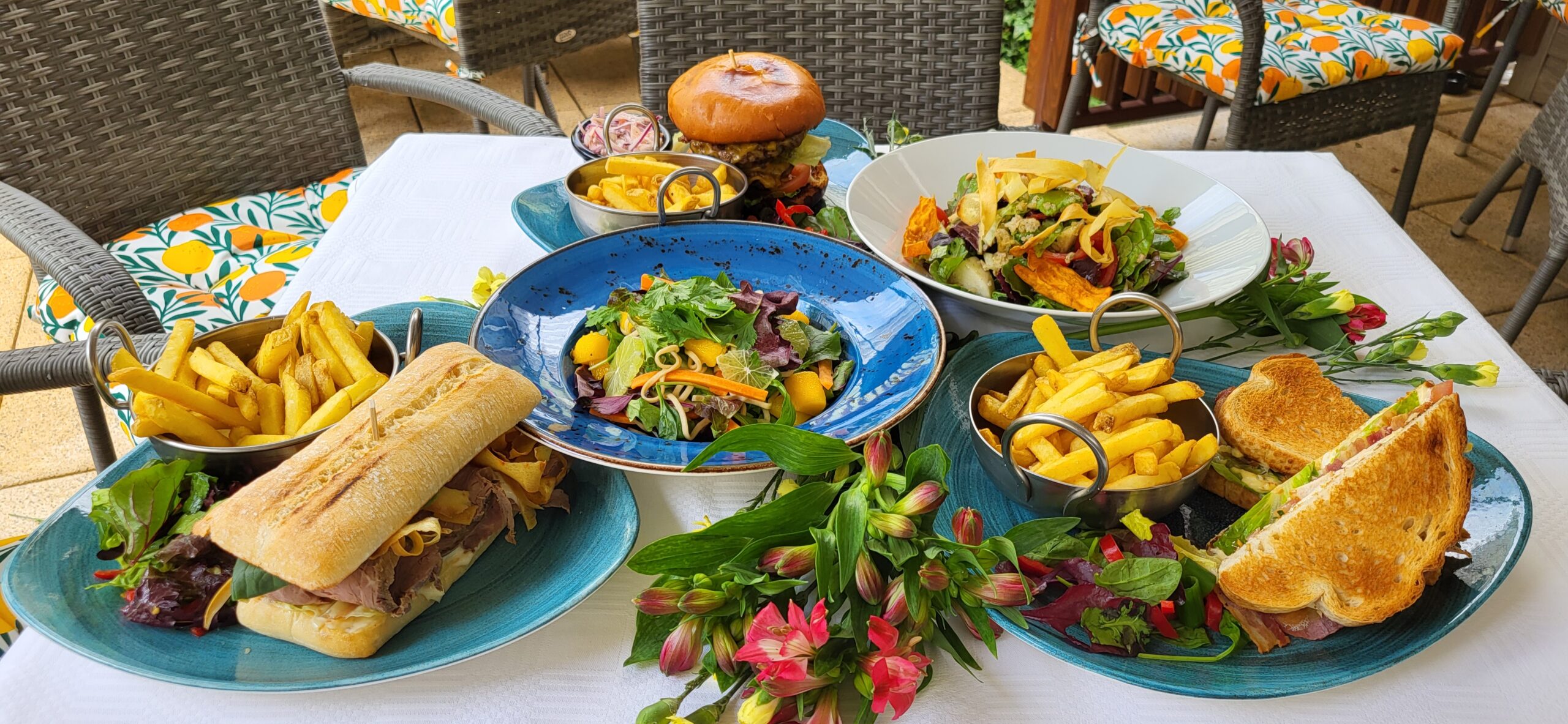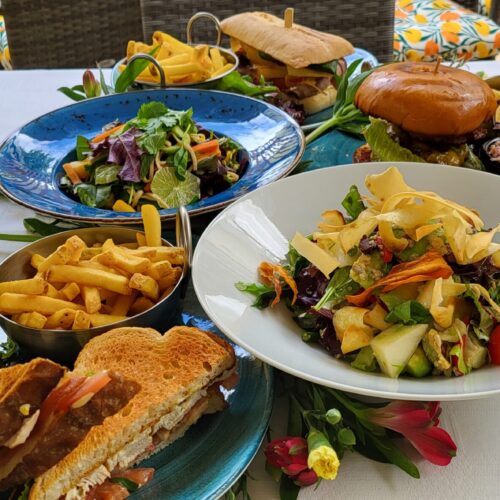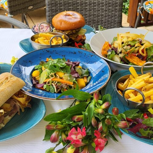 Sweetcorn, Chickpea, Red Kidney Beans, Mixed Herbs & Onions in a Beetroot Brioche Bun served with Ballymaloe Relish, Chips & Salad