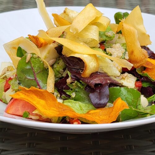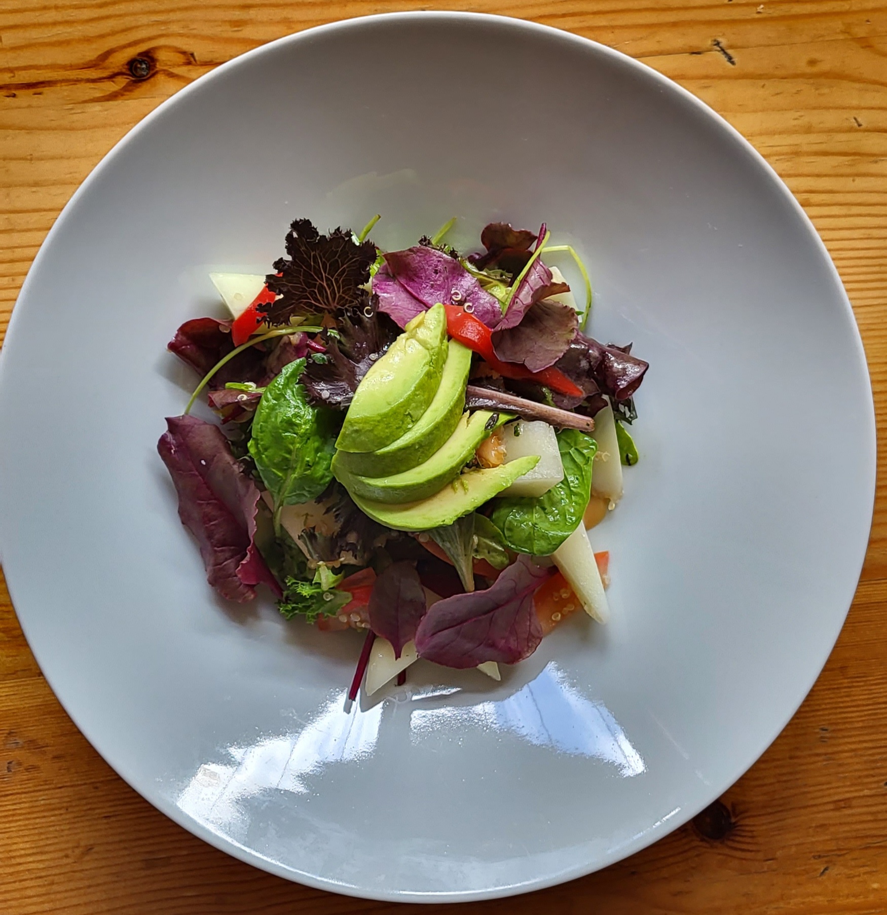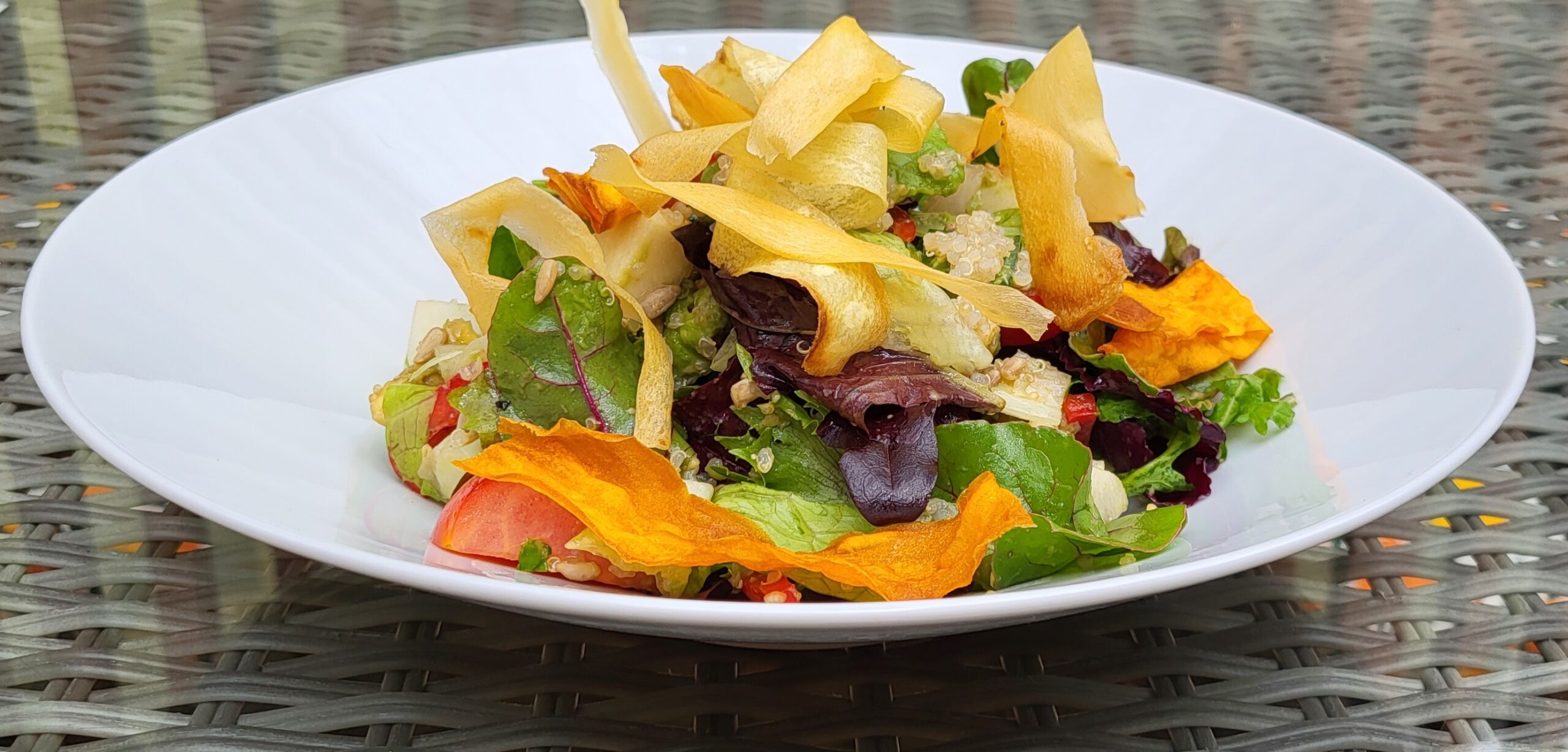 Grilled Peri Peri Chicken Fillet, Pear, Sweet Potato Crisp, Tomato, Spiced Dressing, Baby Leaves