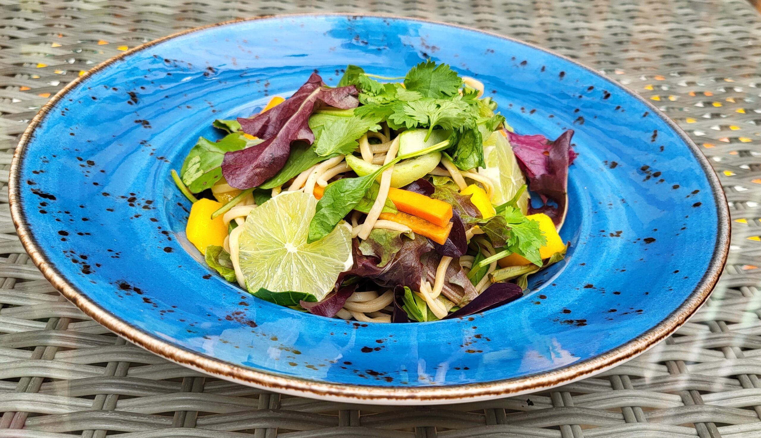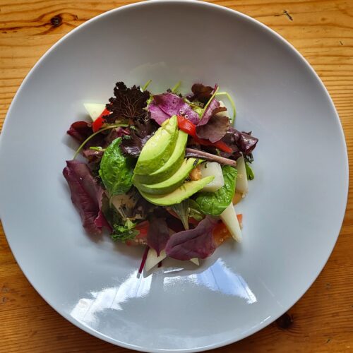 Grilled Peri Peri Chicken Fillet, Pear,Sweet Potato Crisp, Tomato, spiced Dressing, Baby Leaves