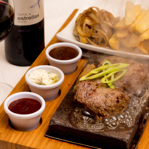 served with hand-cut chips, sauteed mushrooms, onions and sauces