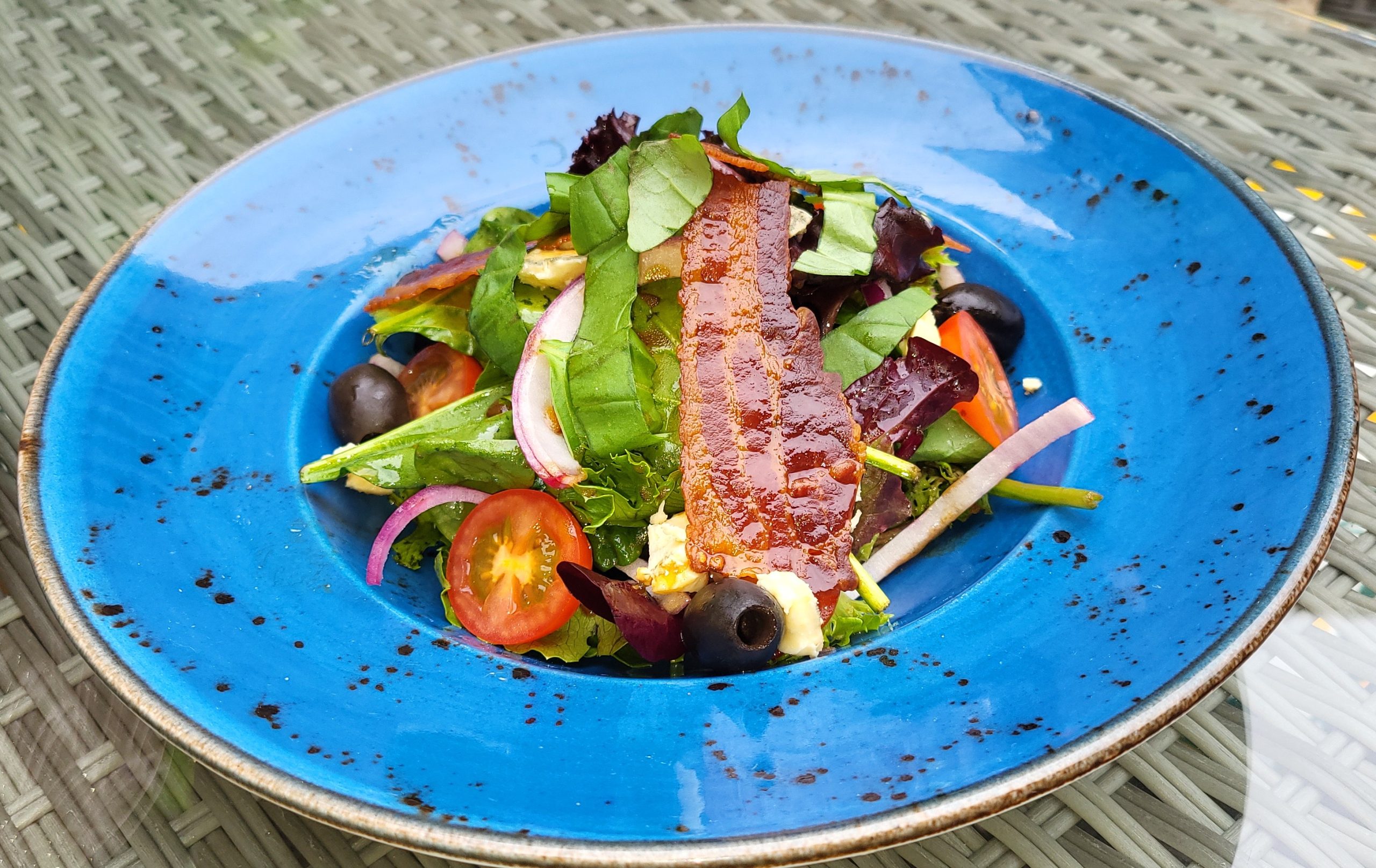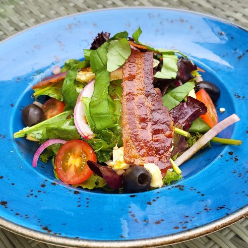 Crispy Bacon, Blue Cheese, Red Onions, Black Olives, Mixed Leaves, Olive Oil & Balsamic Vinegar Dressing